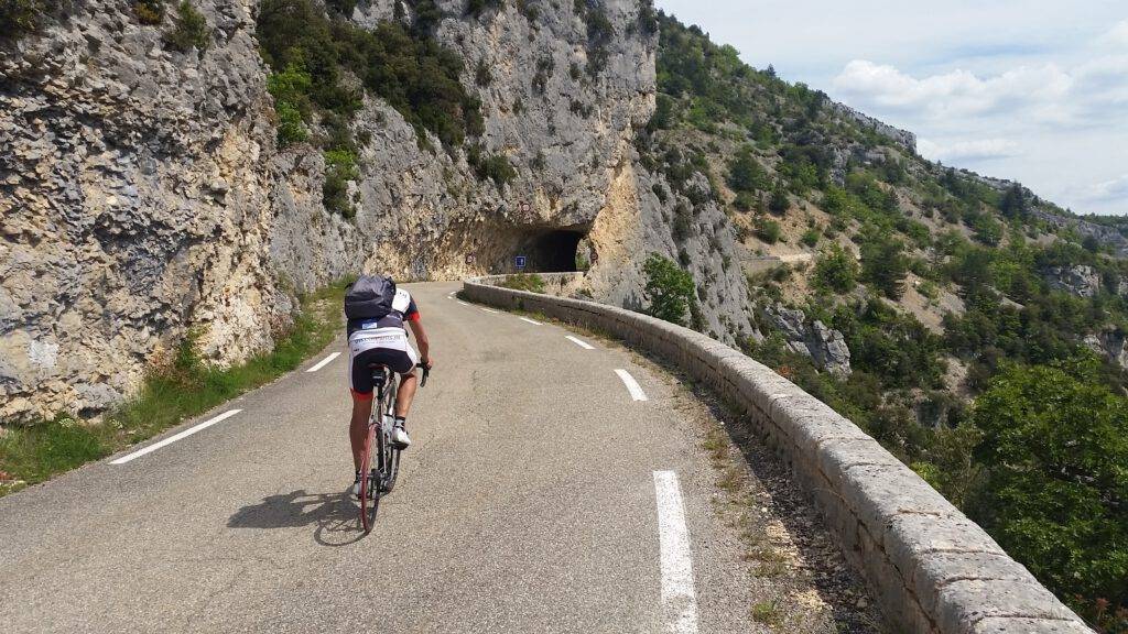 De zeventien kilometer lange, rustige weg voert je langs overhangende rotsen en door talrijke tunneltjes en overbrugt slechts een hoogteverschil van 400 meter tegen ruim twee procent gemiddeld. Frans vlak dus. Wil je optimaal genieten van een magnifiek uitzicht, fiets dan over de D1 vanuit Sault naar Bèdoin en daal af naar Villes-sur-Auzon. Hier begint de klim door de Gorges de la Nesque naar het plaatsje Monieux en terug naar Sault. In totaal een rit van 82 kilometer met een ‘kleine’ 2.000 hoogtemeters. En dit alles onder de rook van de Mont Ventoux.
